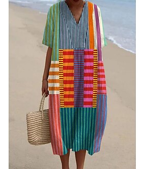 Vestido Midi Feminino Vestido de Praia Vestido A Line Semelhante a Linho Férias Casual Praia Saindo Ajuste Solto Gráfico Geométrico Manga Curta V Neck Rosa Azul Caqui Verão