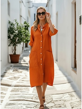 Mulheres Vestido midi Vestido casual Vestido de linho de algodão Elegante Moda Moderno Ao ar livre Férias Para Noite Normal Tecido Manga Curta Colarinho de Camisa Azul Preto Laranja Verde Verão