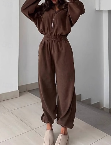 Mulheres Loungewear Macacões Moda Desporto Casual Cor imaculada Zíper Férias Casa Encontro Manga Longa Colarinho de Camisa Preto Branco Vinho Marron Cinzento Escuro Primavera Outono Inverno Moderno