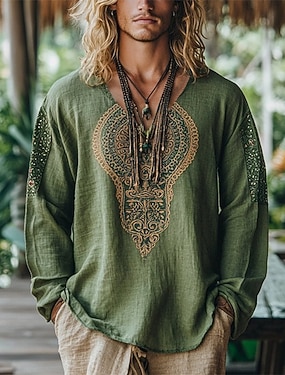 Homens Camisa de linho camisa de verão camisa vintage Camisa étnica Camisa de manga longa Boho Férias Rua Verde Manga Longa Decote V Verão Primavera Roupa Etnico e Religioso