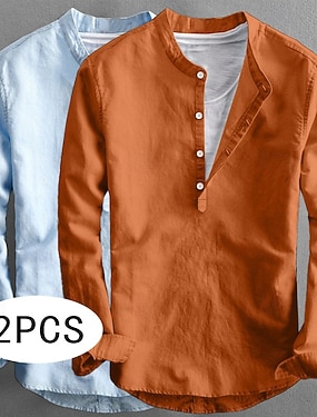 Homens Camisa de linho camisa de verão Roupa de Praia Camisa de colarinho de banda Côr Sólida Férias Casual Cinza claro + azul Cinza escuro + cinza claro Azul+Caqui Cáqui + Cinza Escuro Manga Longa
