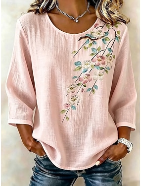 Camiseta Boho Feminina Semelhante Ao Algodão Linho T-Shirt Floral Gráficos Plantas Vintage Estilosa Clássica Manga Curta Gola V Tops Regulares Diário Fim de Semana Férias Estampada Branco Rosa