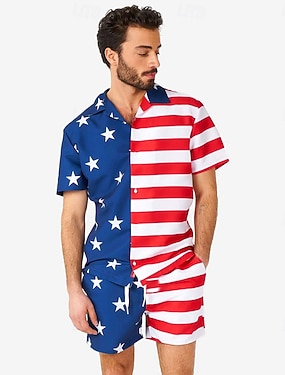 Dia da Independência Americana Homens American US Flag 2pcs Conjuntos de camisas Tops de verão Manga Curta Calças curtas Aberto para a Lateral Esporte & lazer Casual Diário Ao ar livre Diário Traje