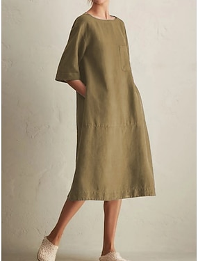 Mulheres Vestido midi Linho de algodão sintético Vestido de turno Vestido de algodão branco Básico Casual Diário Férias Normal Tecido Manga 3/4 Gola Redonda Preto Vinho cáqui Cinzento Verão