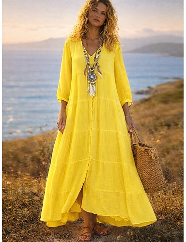 Mulheres Vestido maxi longo Vestido Longo Linho de algodão sintético Camisetão Vestidos Para o Verão Vestido Kaftan Férias Básico Moderno Diário Final de semana Ajuste Largo Tecido Manga 3/4 Decote V