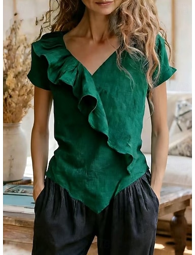 Mulheres camisa de verão Camisa casual Blusa Frufru Côr Sólida Vintage à moda Manga Curta Decote V Tops regulares Diário Feriado Para Noite Azul Preto Vermelho Castanho Claro Verde Verão Primavera