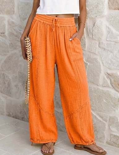 Mulheres Linho de algodão sintético Perna larga chinês Calça verão Férias Roupa de rua Casual Comprimento total Cintura Média Tecido Com Cordão Bolsos Respirável Micro-Elástica Diário Ao ar livre Rua
