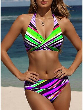 Biquíni Feminino 2 Peças Com Pregas Colorblock Estilo Cheeky Slim Costas Descobertas Elegante Roupas de Praia de Férias Listrado Decote Halter Sem Mangas