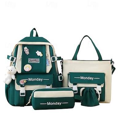 Conjunto de mochila verde 5 em 1 para meninas com acessórios fofos – mochila escolar leve com bolsa, estojo e bolsa com cordão para estudantes adolescentes e uso diário
