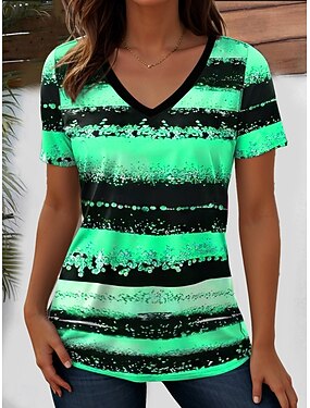 Páscoa Mulheres Camiseta Imprimir oceano Listrado Casual Manga Curta Decote V Tops regulares Diário Para Noite Final de semana Azul Preto Branco Vermelho Verde Verão