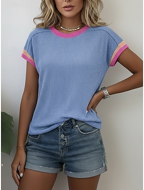 Mulheres Tops tricotados em costura Camiseta T-shirt Bolsos Gráfico Geométrica Listrado Moda à moda Clássico Manga Curta Gola Redonda Decote Redondo Tops regulares Diário Para Noite Final de semana
