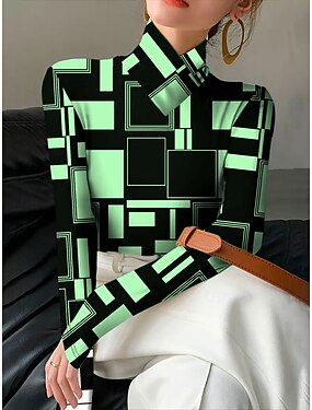 Mulheres Camiseta Imprimir Em Camadas Gráfico Geométrica Elegante Vintage à moda Manga Longa Gola Alta Pescoço Assimétrico Tops regulares Diário Azul Preto Rosa Roxo Verde Primavera Outono Inverno