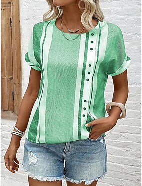 Camiseta Feminina Linho Como Respirável Leve Elegante Padrão Listrado com Detalhes de Botão Gola em V Manga Curta Verão Primavera Casual Uso Diário Ajuste Versátil Cinza Preto Off-white