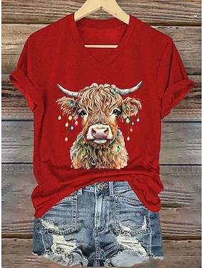 Camiseta Feminina Gráfica Animal Vaca Vintage Estilosa Clássica de Manga Curta Decote em V Tops Regulares Diários Estampado Azul Preto Branco Rosa Vermelho Verão Primavera Outono Inverno