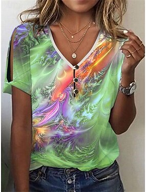 Mulheres Camiseta Camisa Henley Com Corte Botões Imprimir Gráfico Básico Neon & Bright Manga Curta Decote V Tops regulares Diário Final de semana Azul Roxo Verde