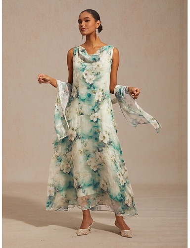 Vestido longo de chiffon fluido com estampa floral e camadas