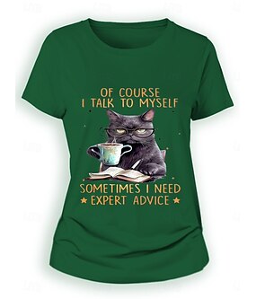 Mulheres Camiseta Imprimir Gato Letra Casual Manga Curta Decote Redondo Tops regulares Diário Azul Preto Verde Verão