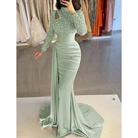 Vestido de Noite Sereia Lantejoula Vestido Elegante Formal Cauda  Penteado Manga Longa Decote Alto Cetim com Pérolas Vestido de Máscara
