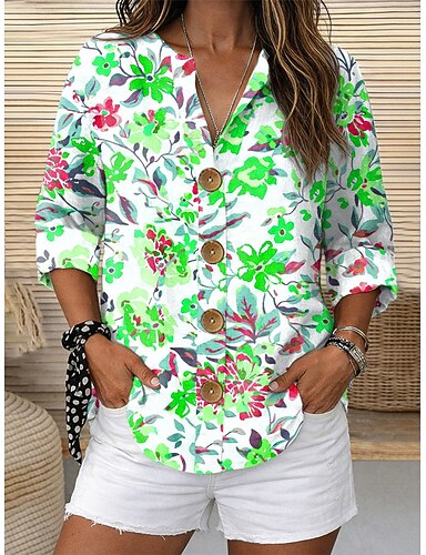 Mulheres Camisa Social Imprimir Floral Gráfico Elegante Vintage Tropical Meia Manga Decote V Tops regulares Diário Feriado Roupa de Praia Azul Rosa Verde Bege Cinzento Verão Primavera