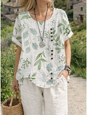 Mulheres Camiseta Linho de algodão sintético T-shirt Botões Tecido Moda à moda Clássico Manga Curta Gola Redonda Tops regulares Diário Para Noite Final de semana Azul Branco Amarelo Verde Tropa