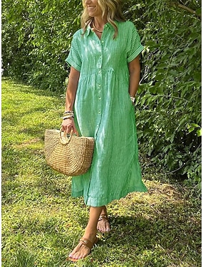 Mulheres Vestido midi Linho de algodão sintético Vestido de turno Vestido Maxi Algodão Casual Ajuste Largo Listra Manga Curta Colarinho de Camisa Lapela Azul Amarelo Claro Preto Branco Verão