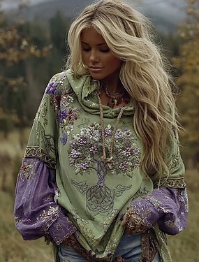 Camiseta Feminina de Manga Longa Vintage Étnica Casual Impressão Manga Longa Longa Tops Gola Careca Diária Vermelha Roxa Verde Outono Inverno Pré-outono