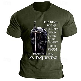 Camiseta Gráfica Masculina de Manga Curta Cavaleiro Citação "O Diabo Me Vi... Amém" Motivação de Fé e Resiliência