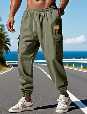 Homens Calças de linho Calça verão Calças largas Punho com Elástico Tecido Conforto Respirável Comprimento total Casual Diário Ao ar livre Férias Vintage Verde Tropa Vermelho Sem Elasticidade