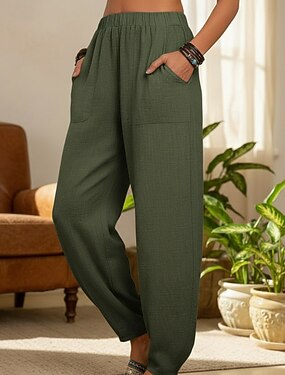 Mulheres Linho de algodão sintético Calças Calça verão Casual Comprimento total Natural Tecido Bolsos Cintura elástica Exterior Confortável Rua Para Noite Magenta Azul Céu Cinzento Preto Verão Normal