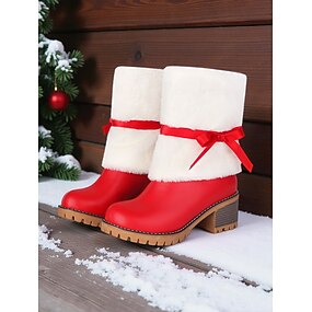 Botas de inverno femininas vermelhas com salto bloco – botas inspiradas no Papai Noel com acabamento em pele sintética e detalhe de fita, perfeitas para festas de Natal e looks casuais.