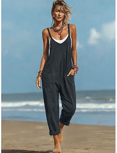 Mulheres Normal Macacão Ativo Côr Sólida Sem Manga Decote V Bolsos Diário Praia Ajuste Largo Preto Vinho Roxo Verão
