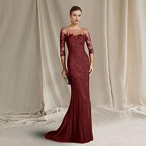Sereia Cauda Escova Vestido formal Vestido de noite Meia Manga Scoop pescoço Elegante Formal Convidado do casamento Renda Tule Vestido Para Mãe dos Noivos com Apliques