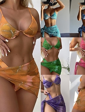 Biquíni Feminino de 3 Peças com Aro Saia Slim Sem Costas Roupas de Praia para Férias Cor Sólida Decote Halter Sem Mangas