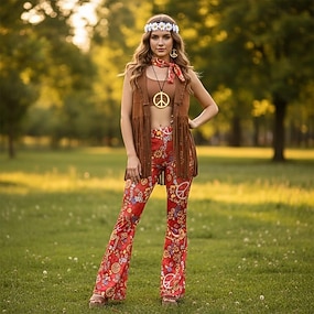 Conjunto Retro Vintage Anos 70 Roupa Colete Calça boca de sino com acessórios Hippie Fantasia Mulheres Dia Das Bruxas Carnaval Casual / Diário Festival de Música Adulto Peitilho Blusa Calças