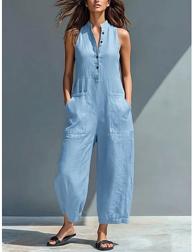 Macacão feminino casual em linho sintético, algodão misto, cor sólida, sem mangas, pernas largas, decote em U, bolso, botões, para uso diário, férias, modelagem solta, nas cores azul, preto e azul