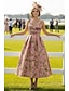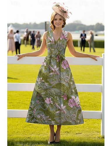 Linha A Até o Tornozelo Longuette Vestido de Derby Vestidos de cocktail Elegante Vintage Sem Manga Decote V Formal Kentucky Derby Bolsos Jacquard com Pregas