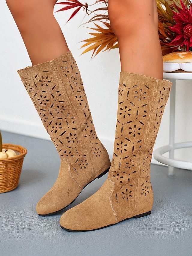 Botas femininas de cano médio com recortes florais, estilo boho casual para uso diário e nas ruas de outono #10341311