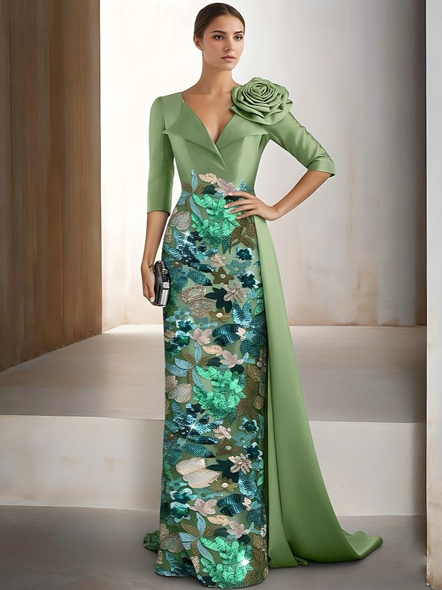 Tubinho Longo Bordado com miçangas Vestido formal Vestido para a mãe da noiva Vestidos de noite Vestido de baile com sobressaia Vestido formal Elegante Brilhante Floral Manga 3/4 Lapela Casamento #10524799