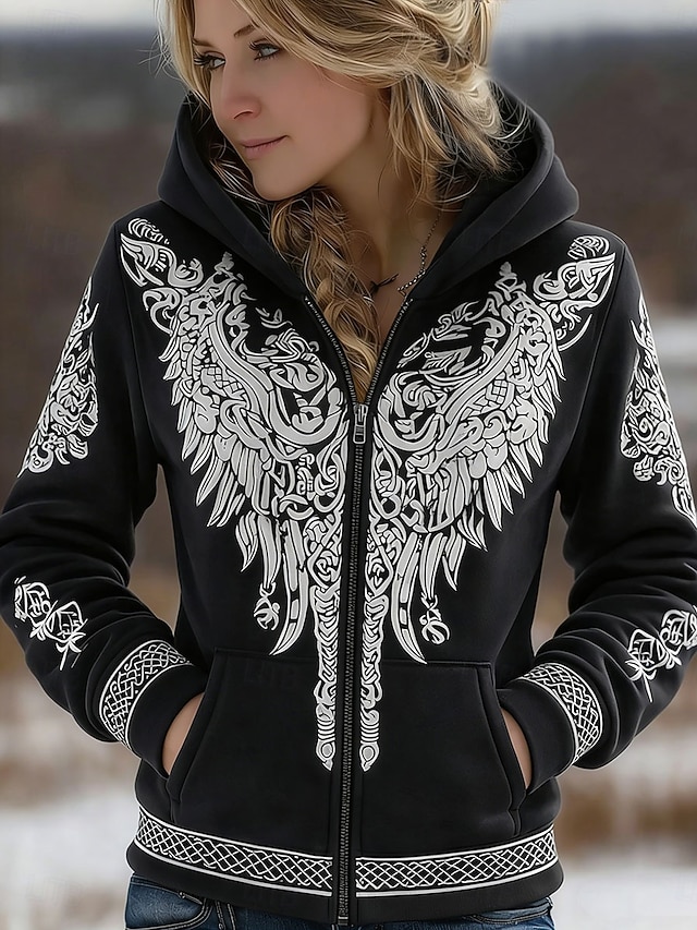 Gênero:Mulheres,Estilo:Casual,Moda,Boho,Estampado,Ocidental,Confortável,Ocasião:Casual,Rua,Dia a Dia,Tipos de Blusa:Moletom com zíper,Decote:Com Capuz,Tecido:Poliéster,Detalhes:Imprimir,Bolsos,Zíper,Comprimento da Manga:Manga Longa,Elasticidade:Com Stretch,Cuidados:Lavar na Maquina,Comprimento do Camisa:Tops regulares,Estampa:Gráfico,Geométrica,Estação:Inverno,Outono,Categoria:Moletom,Moletom,Corte da Peça:Normal,