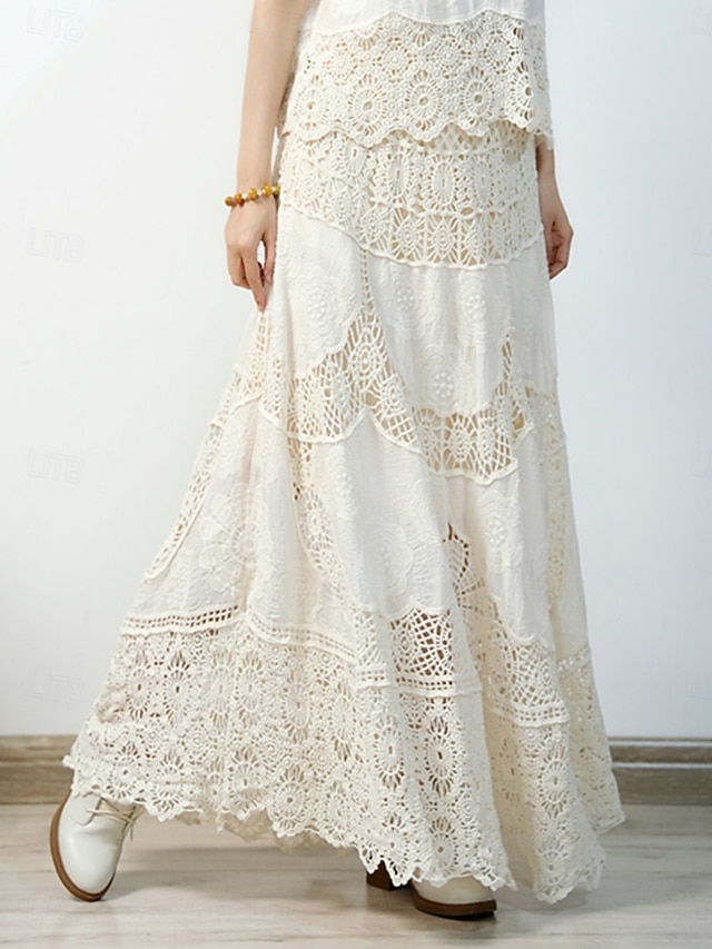Mulheres Saia de renda Boêmia Moda Casual Longo Cintura Média Saias Cor Sólida Renda Buraco Sem Elasticidade Diário Férias Branco Bege Verão Algodão#11288600