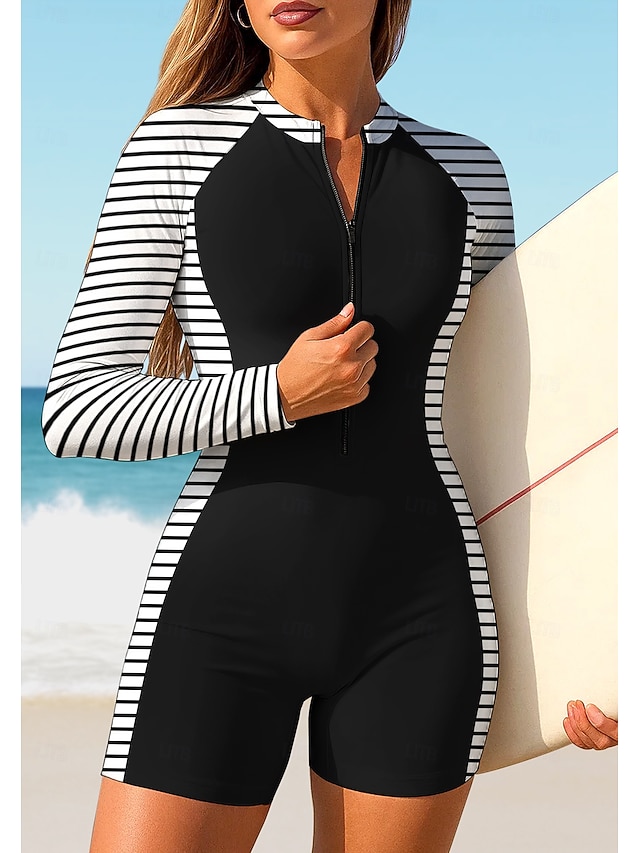 Mulheres Anti Atrito Maiô de surfe de uma peça Roupa de banho Geométrica Riscas Bloqueio de cores Zip Up Com sutiã embutido Bojo Removível Proteção Solar UV UPF50+ Ultra Leve (UL) Manga Longa Roupa#11814155