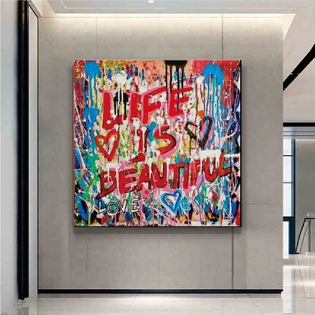 [Destaques do Design] A obra apresenta um estilo de graffiti abstrato com uma combinação vívida de vermelhos, azuis, verdes e amarelos, criando uma sensação dinâmica e expressiva. O texto vermelho proeminente "A Vida é Bela" e as formas de corações desenhadas à mão adicionam uma mensagem poderosa e positiva à peça. O design inclui respingos e gotas envolventes, que contribuem para o apelo vibrante da arte urbana de rua.