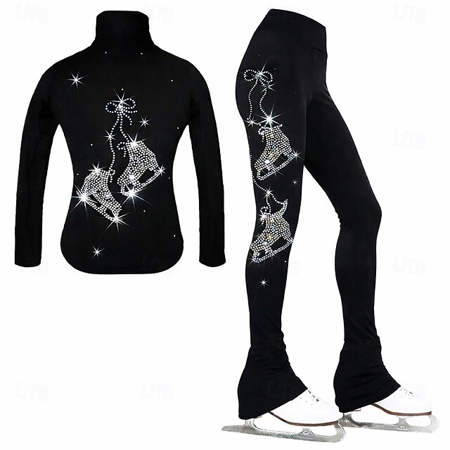 Jaqueta de patinação artística com calça, conjunto feminino/infantil para patinação no gelo, preto, elástico, para treino e competição, térmico, com cristais/strass, manga comprida. #14105391