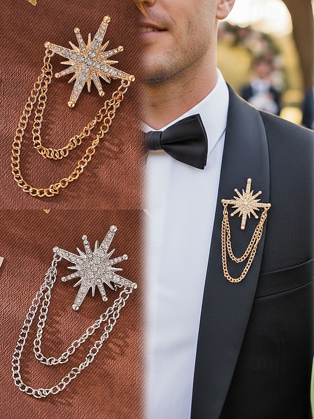Broche masculino em liga de ouro e prata com design elegante e vintage, com cristal em formato de estrela e corrente dupla. Ideal para noivos, casamentos, Dia dos Namorados, festas formais e eventos noturnos.#14626285