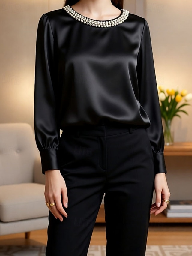 Mulheres Blusa Tops elegantes Franzido Patchwork Com Miçangas Côr Sólida Tecido Elegante senhoras à moda Manga Longa Gola Redonda Tops regulares Diário Trabalho Para Noite Preto Branco Verde Damasco #14749640