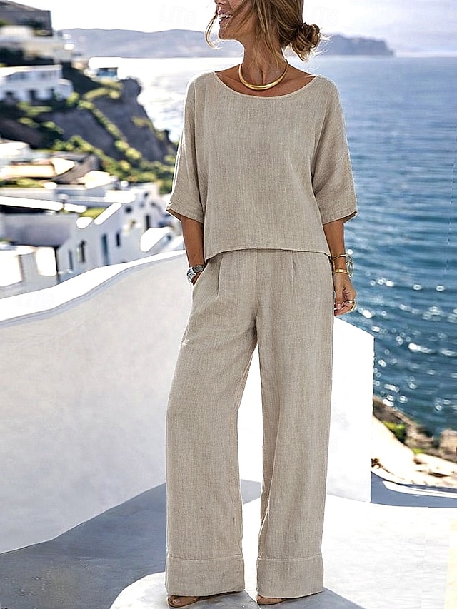 Mulheres Conjuntos de linho de algodão Conjuntos de calças Bolero Top Meia Manga Gola Redonda Côr Sólida Moda Roupa de rua Casual Diário Ao ar livre Azul Preto Branco Verão Normal #14758550