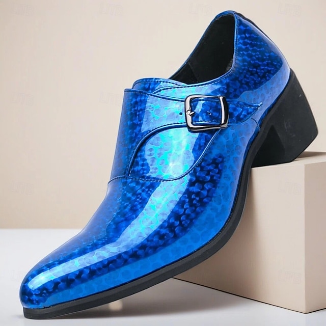 Mocassins masculinos azuis de verniz com fivela - calçado formal elegante para eventos especiais e trajes de noite.#14931148