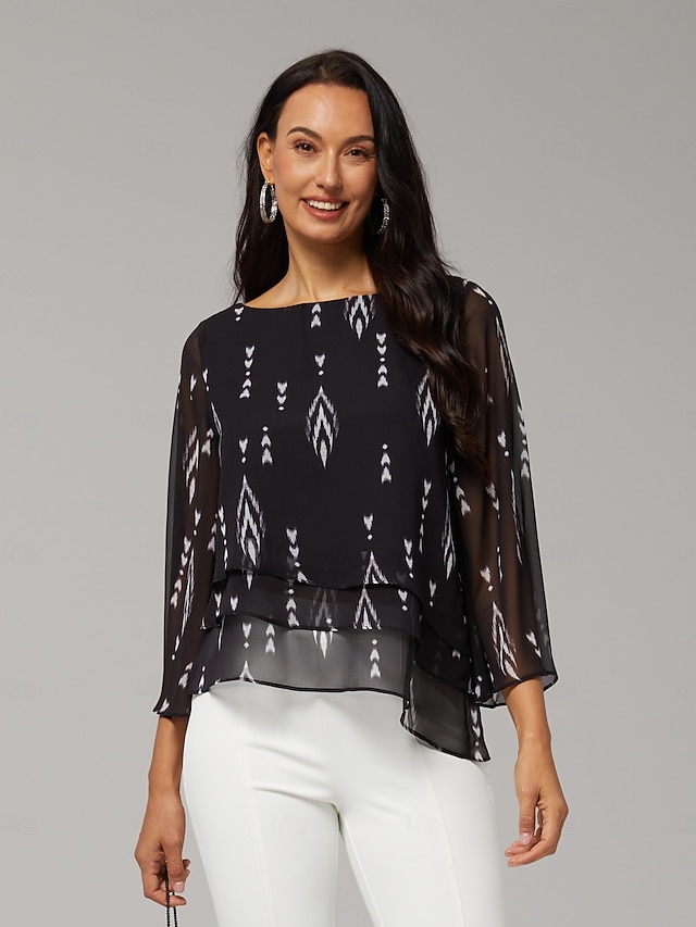 Tecido:Chiffon,Gênero:Mulheres,Feminino,Detalhes:Multi Camadas,Floral,Ocasião:Casual,Estilo:Férias,Solto,Elegante,Decote:Decote Redondo,Arredondar,Comprimento da Manga:3/4 de Manga,Elasticidade:Sem Elasticidade,Cuidados:Lavar a Mão,Lavar na Maquina,Estampa:Floral,Abstrato,Estação:Verão,Primavera Verão,Primavera,