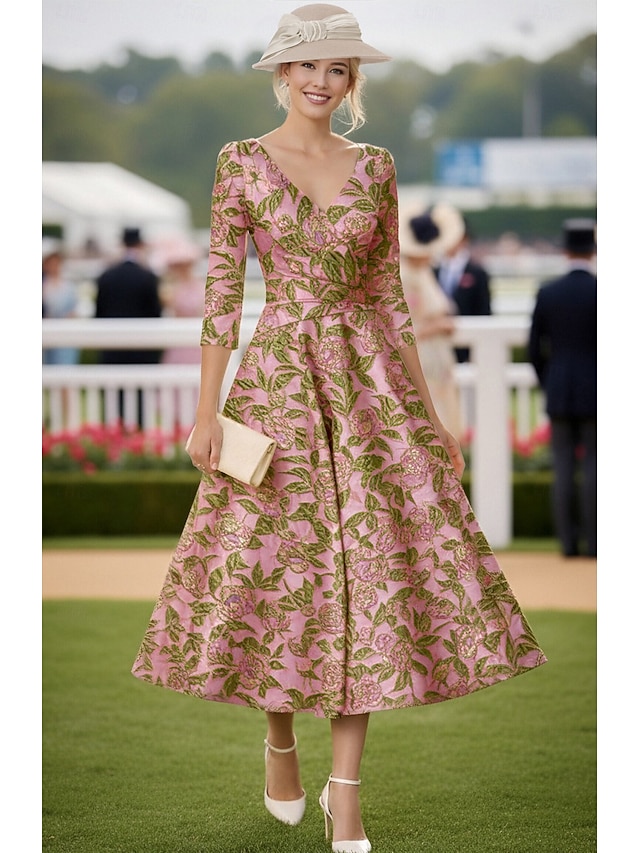 Linha A Longuette Vestidos de cocktail Elegante Floral Manga 3/4 Decote V Casamento Formal Bolsos Jacquard com Pregas #15478034