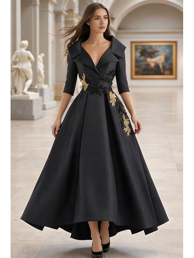 Linha A Longo Camisetão Vestido de convidada de casamento Vestido formal Vestido Para Mãe dos Noivos Manga 3/4 Colarinho de Camisa Elegante Split alta Casamento Formal Cetim com Estampa floral